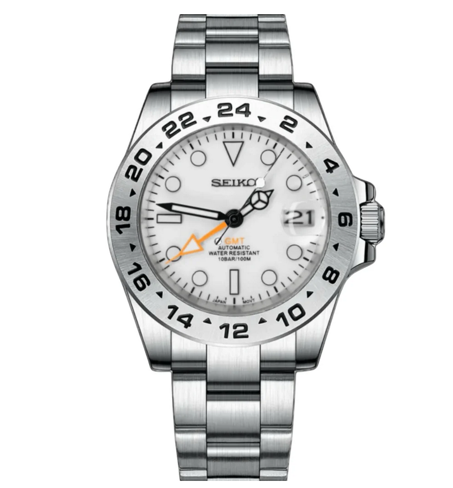 Introducing the Seiko Mod GMT Explorer, a custom NH34 Automatic Watch inspired by the iconic Rolex GMT Explorer, meticulously crafted for watch enthusiasts seeking uniqueness and precision. This mode features a GMT steel bezel and a transparent back piece, allowing a glimpse into the intricate automatic movement.